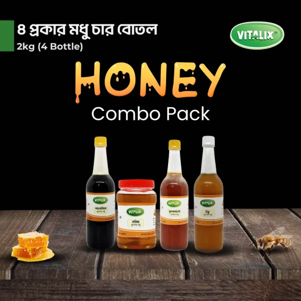 ৪ প্রকার মধু চার বোতলে মোট ২ কেজি মধু থাকবে। এটি একটি হানি কম্ব প্যাকেজ। এই ৪ প্রকার মধুর নাম ও ওজনঃ ৫০০ গ্রাম সুন্দরবনের বক্সের মধু + ৫০০ গ্রাম লিচু ফুলের মধু + ৫০০ গ্রাম সরিষা ফুলের মধু + ৫০০ গ্রাম কালোজিরা ফুলের মধু।